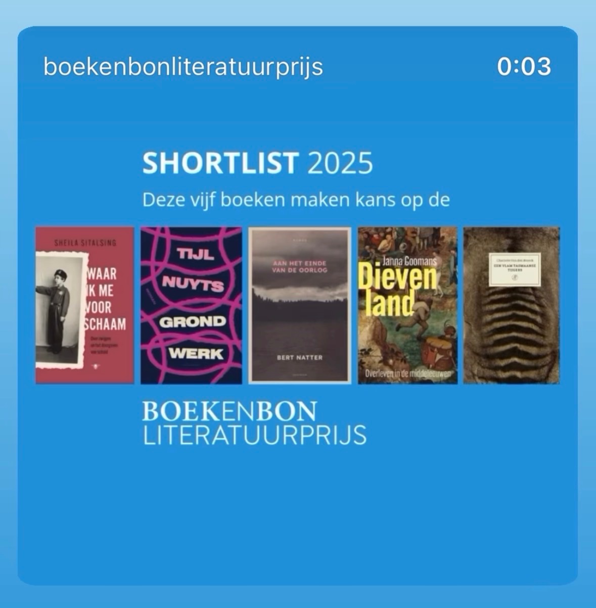 De andere kanshebbers zijn: Sheila Sitalsing met Waar ik me voor schaam, Tijl Nuyts met Grondwerk, Janna Coomans met Dievenland en Charlotte Van den Broeck met Een vlam Tasmaanse tijgers.