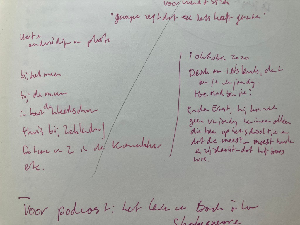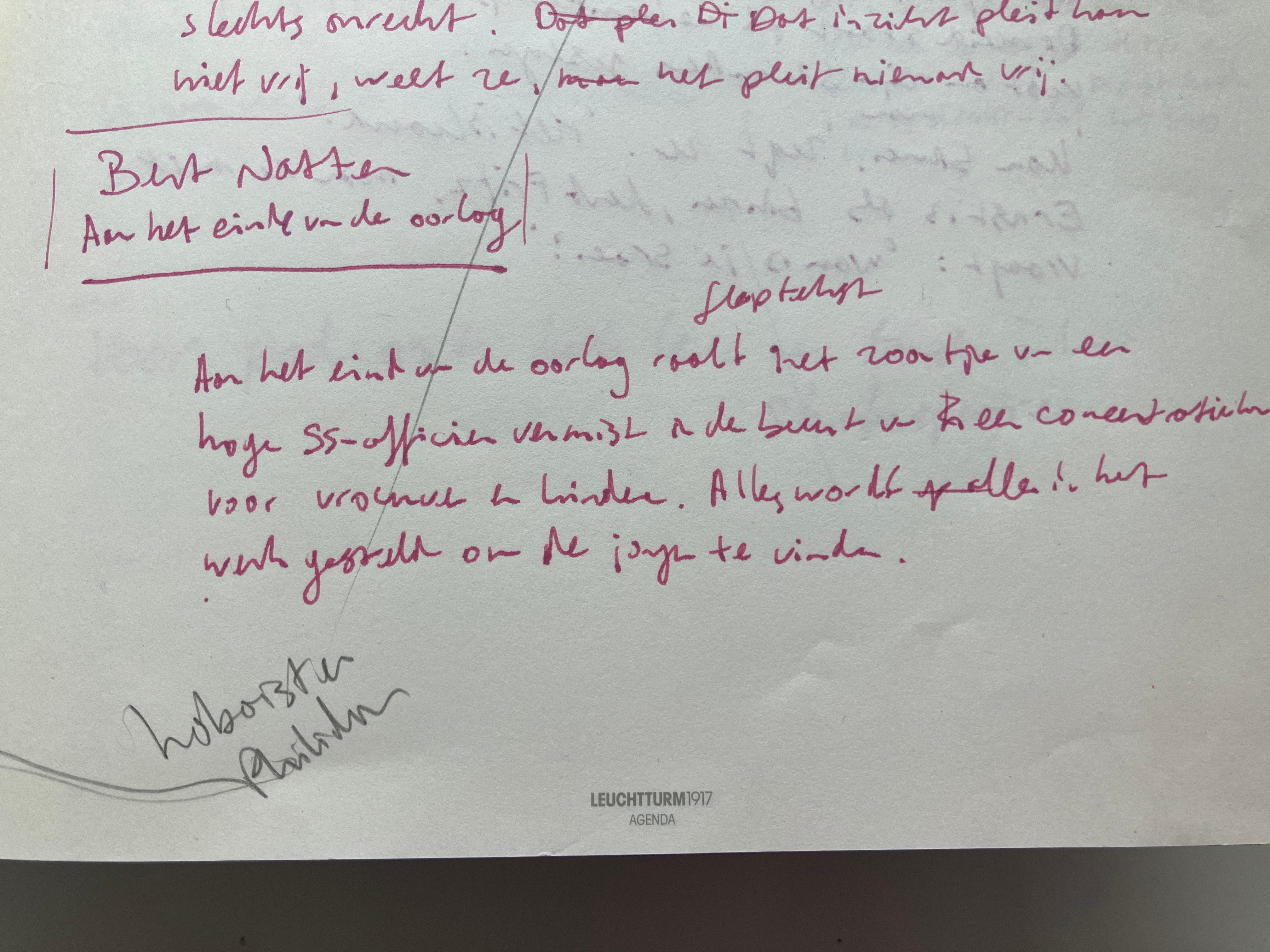 Ook schreef ik die ochtend een eerste scène, over een toen nog naamloze communiste die het zoontje (toen al ‘Ernst’) van de officier heeft gegrepen, ik ga die hier niet helemaal citeren, maar de eerste regel in mijn aantekeningenboek luidt: ‘Wat staat ze hier te doen met dit kind tegen zich aan?’ En aan het einde staat de rechtvaardiging voor haar daad: ‘Hier, op deze plek, bestaat slechts onrecht.’