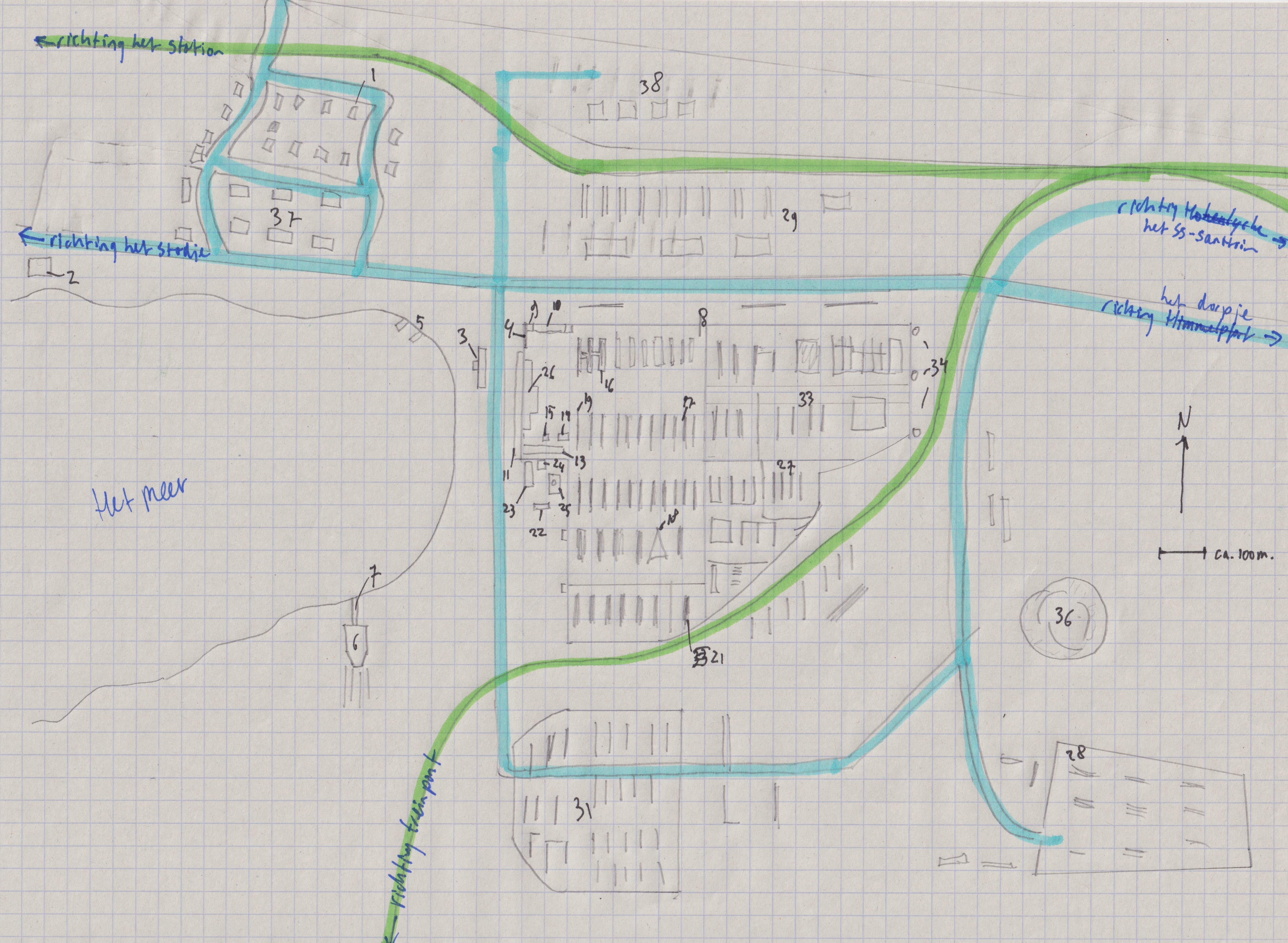 In het kader van mijn documentatie las ik tijdens een slapeloze nacht in Sarah Helms standaardwerk over Ravensbrück If This is a Woman (2015) een verhaal over een ondercommandant die eerder in Auschwitz had gewerkt. Daar speelden zijn kinderen in het kamp en droegen ze een penning om hun nek, waarop stond dat ze zijn zoon waren, om te voorkomen dat ze in de gaskamer zouden eindigen. Volgens Helm werd deze officier eind 1944 overgeplaatst naar Ravensbrück. Onder zijn leiding werden daar in januari 1945 bij het crematorium een kleine kleedruimte en een houten gaskamer gebouwd. Uit Auschwitz nam hij een Sonderkommando mee, bestaande uit meer dan tien Joodse mannen die gedwongen werden in het buiten de muur verrezen complex te werken. Ik kende de kaart van het gebied uit mijn hoofd en ik wist hoe dicht dit complex bij de oever van de Schwedsee werd gebouwd en dat even verderop een villawijkje was waar de officieren uit het kamp met hun gezinnen woonden.