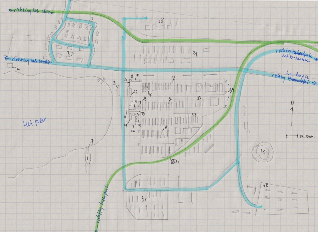 Na een dag of tien schetsjes maken van scènes, onder andere van de dood van Ernst en ook van de executie van het Sonderkommando, stelde ik een lijstje op met ‘korte aanduidingen van plaats’ waar de scènes zich moesten afspelen:
