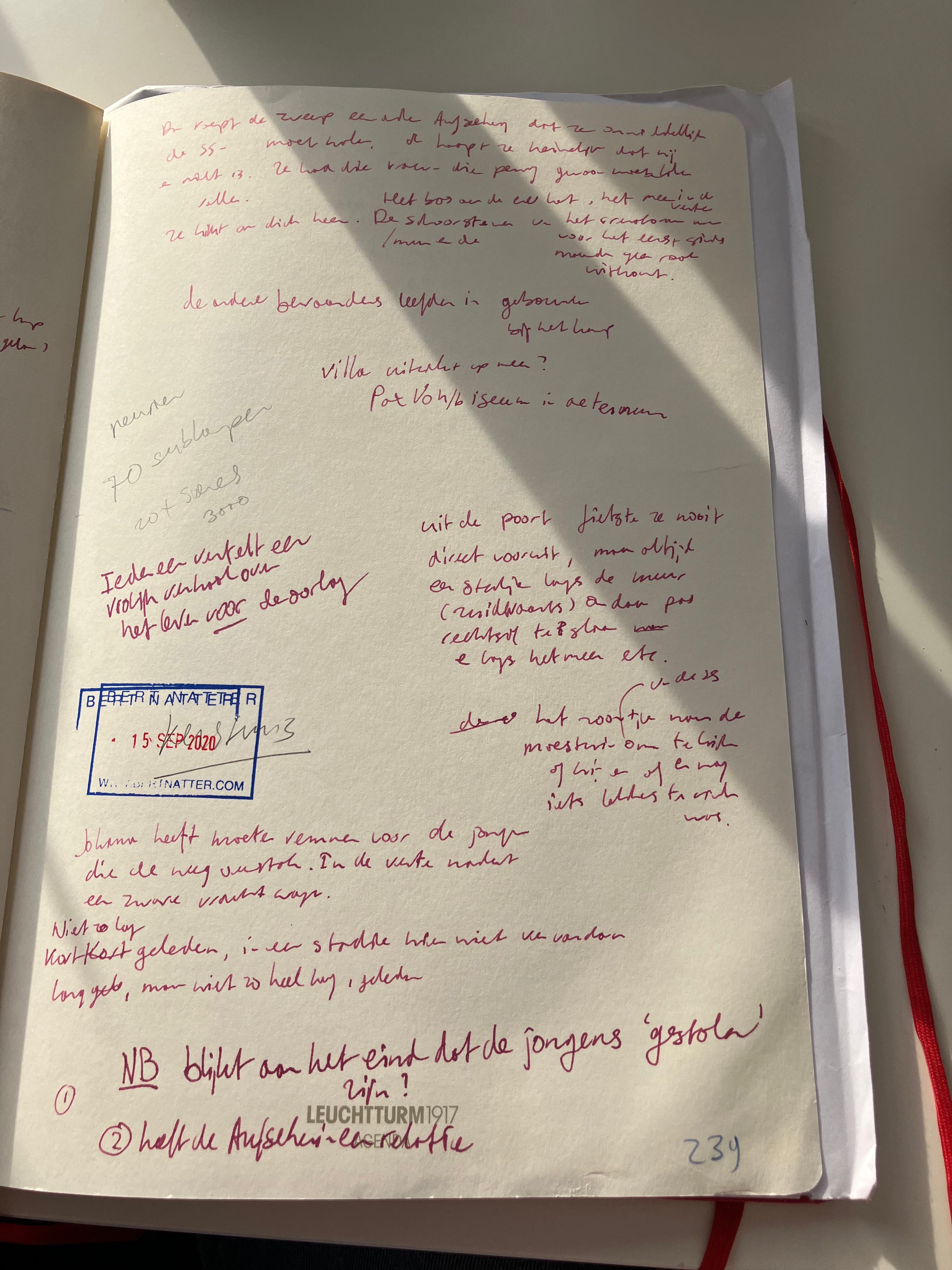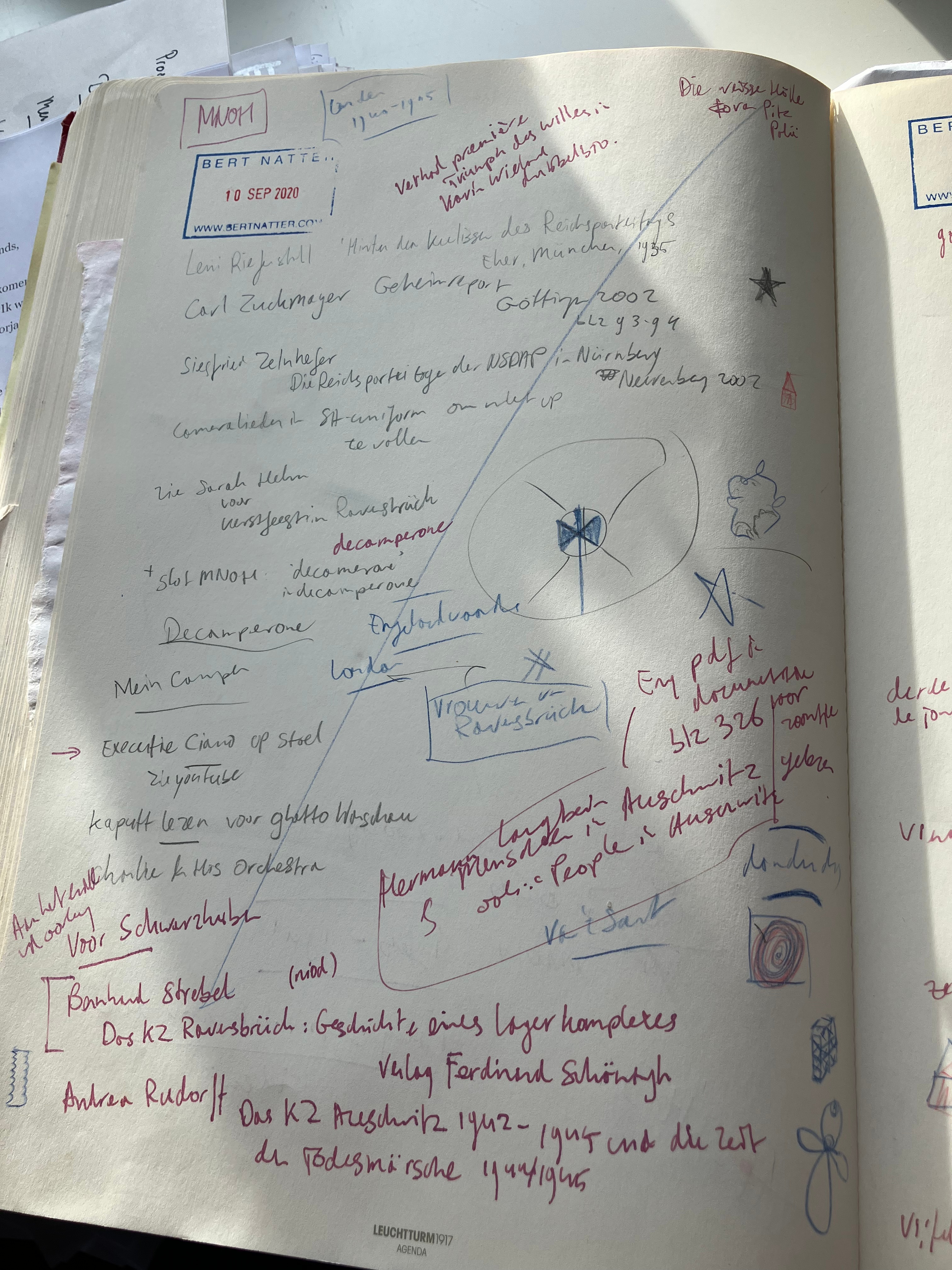 Op 10 september 2020 was ik al in Sarah Helm aan het lezen (blijkbaar werd ik getroffen door wat zij over het kerstfeest in Ravensbrück schrijft). Ik maakte (slordige) aantekeningen voor een andere roman over de oorlog, waar ik toen vaak over nadacht en aan werkte: Maar niet ons hart. De aantekeningen onderaan in rode inkt over boeken over Ravensbrück en Hermann Langbeins Menschen in Auschwitz dateren van 16 september. Je kunt zijn indrukwekkende getuigenis tijdens het Auschwitzproces in Frankfurt (1964) beluisteren via youtube.