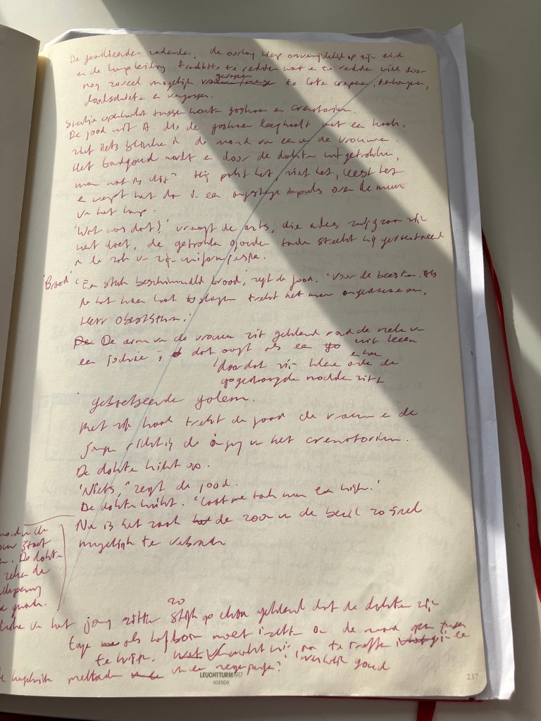 In mijn vorige stuk toonde ik wat aantekeningen van 16 september en hoe het verder ging, maar deze archiefvondst, met aantekeningen die daaraan voorafgingen, wilde ik even laten zien. Voor de site van ILFU schreef ik eind juli 2023 een essay waarin ik Brian Eno citeerde, die betoogt dat ‘dingen uit niets ontstaan’, zelfs Beethoven moest hard werken om zijn strijkkwartetten te componeren. Ik wil mezelf niet met Beethoven vergelijken, natuurlijk, maar als ik dit verschrikkelijke geklad van mezelf bezie en ik leg het naast de gedrukte roman die er uiteindelijk uit is gegroeid, denk ik wel: quod erat demonstrandum.