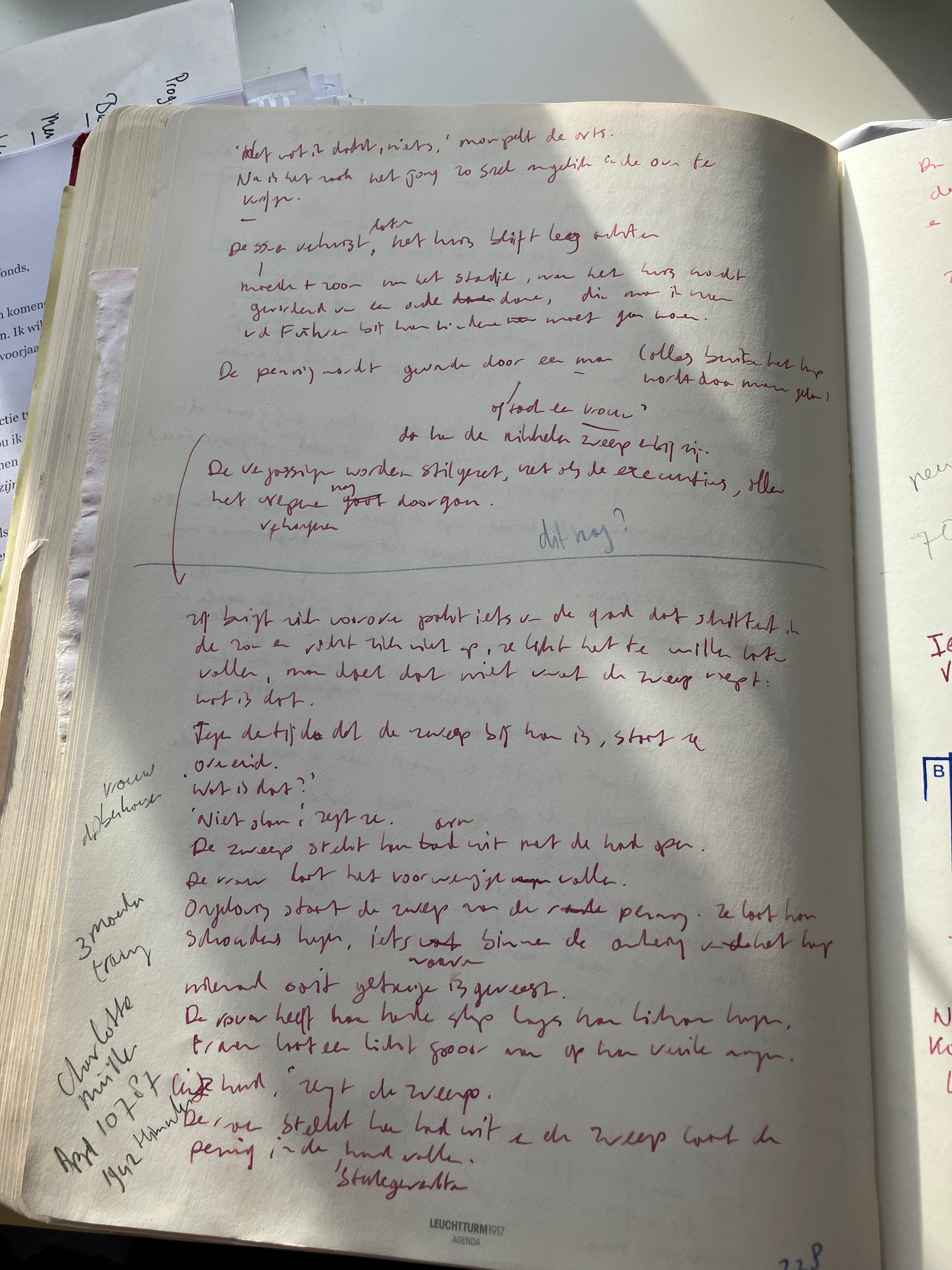 Ook schreef ik een schetsje voor de scène waarin een van de leden van het Sonderkommando in aanwezigheid van een arts de penning vindt en die weggooit en hoe die penning later toch weer wordt gevonden. Ik vind het zelf grappig om te zien dat ik al bezig was met wat ik aspirantschrijvers altijd aanraad: lange lijnen trekken. Sommige voorwerpen kunnen het hele boek mee. In Aan het einde van de oorlog zijn dat, naast die penning, bijvoorbeeld: de DKW en de Beethovenpartituur, de ‘zweep’ van Eva, die ook al in deze aantekeningen opduikt.