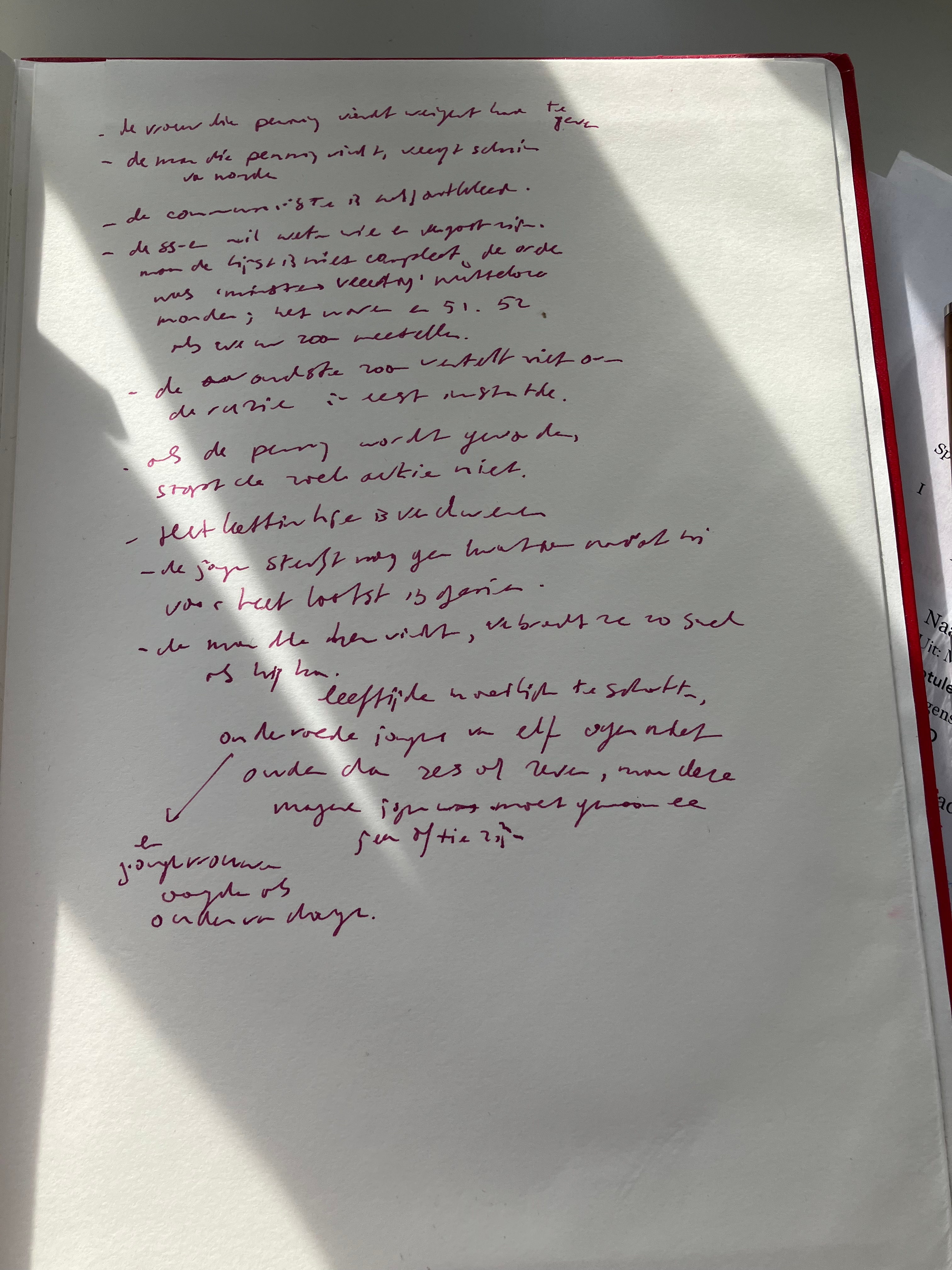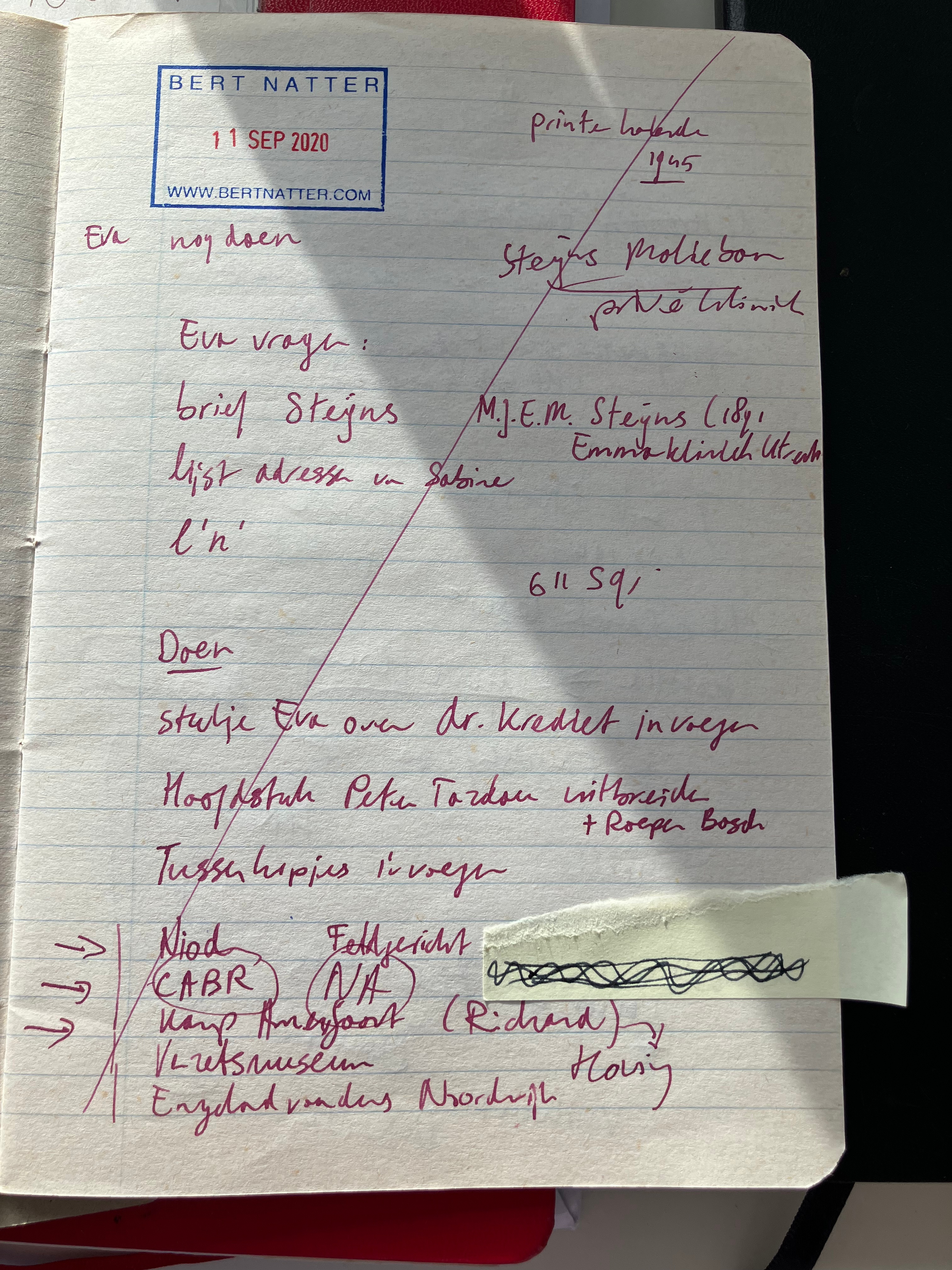 In een schrijftje zie ik dat ik op vrijdag 11 september 2020 nog volop bezig was aantekeningen te maken voor het boek dat ik aan het vertalen, bewerken en uitbreiden was. [Op de foto heb ik de naam van de man die vermoedelijk Sabine Zuur verraadde onleesbaar gemaakt. Naar hem zou ik op 4 december 2020 onderzoek doen in het Centraal Archief Bijzondere Rechtspleging te Den Haag].