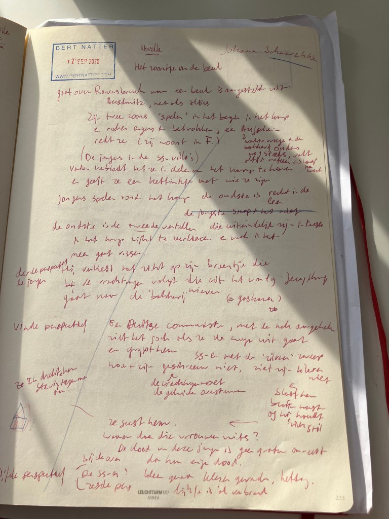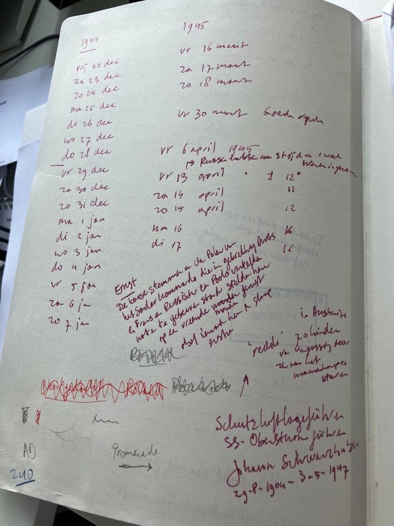 Op 14 september was ik nog bezig met de chronologie. Ik dacht toen blijkbaar nog aan een verhaal in twee delen, dat zich eerst in rond de jaarwisseling 1944/1945 zou afspelen en dan in de aanloop naar de bevrijding van het kamp. Dat werkte ik uit op de laatste bladzijden van dit aantekenboek.
