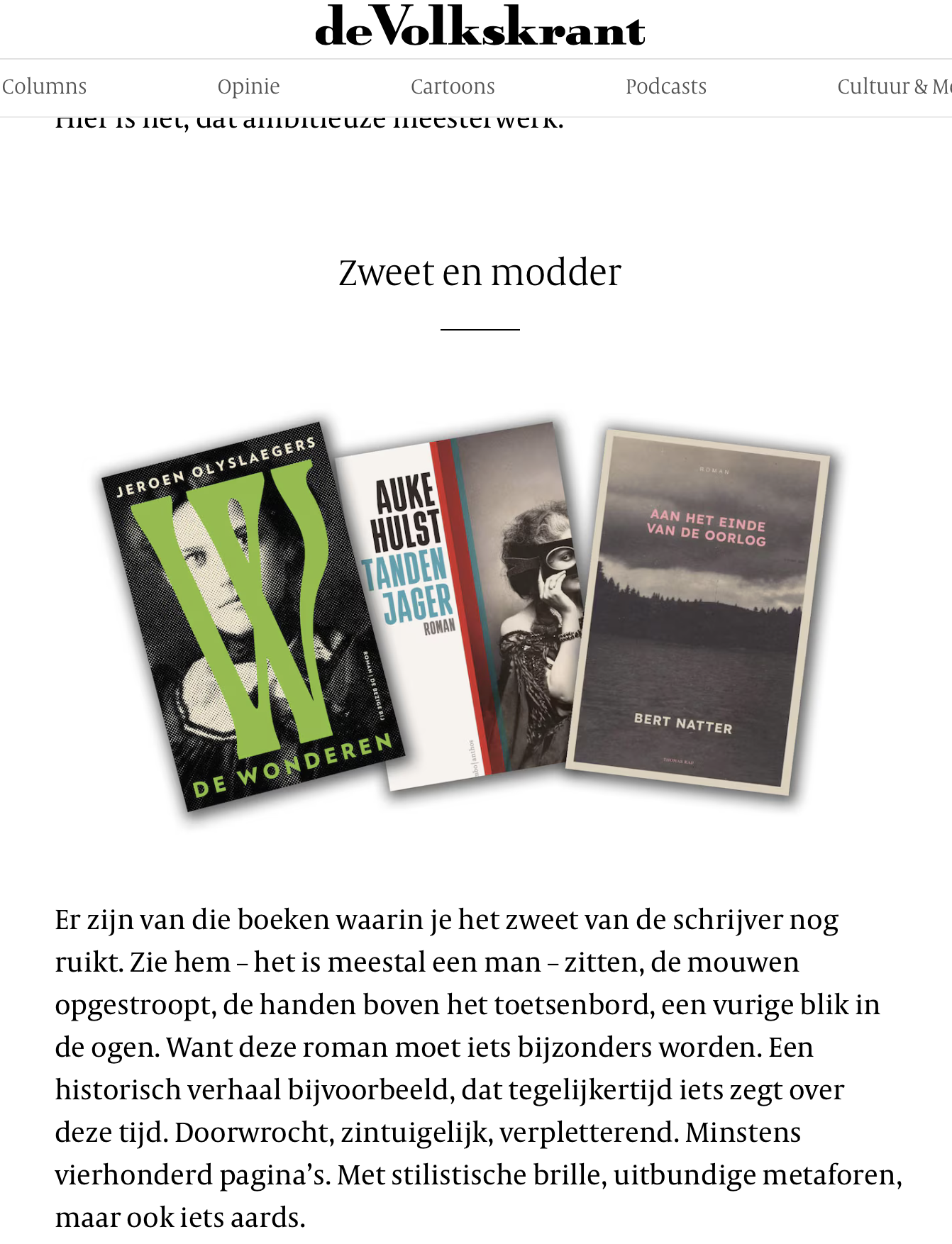 Onder het kopje ‘Zweet en modder’ wordt mijn roman Aan het einde van de oorlog genoemd in het overzicht dat de Volkskrant maakte van het boekenjaar 2025. Fijn dat mijn boek daar in staat. Het gehele overzicht is hier te lezen.