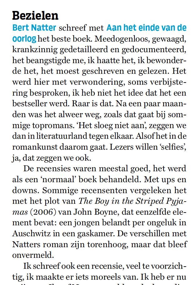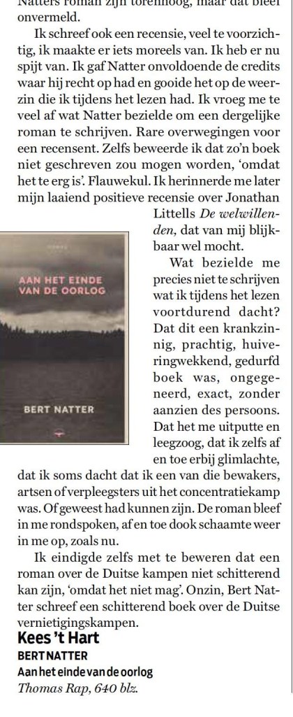 In de Groene noemt criticus en romancier Kees ’t Hart mijn roman Aan het einde van de oorlog ‘het beste boek’ van het jaar. Eerder schreef hij een recensie (hier terug te lezen) waarin hij zich afvroeg of het wel mocht, zo’n boek als dit schrijven. Ik vond dat een interessante vraag, vooral omdat ik met deze kwestie worstelde toen ik aan mijn roman begon.
