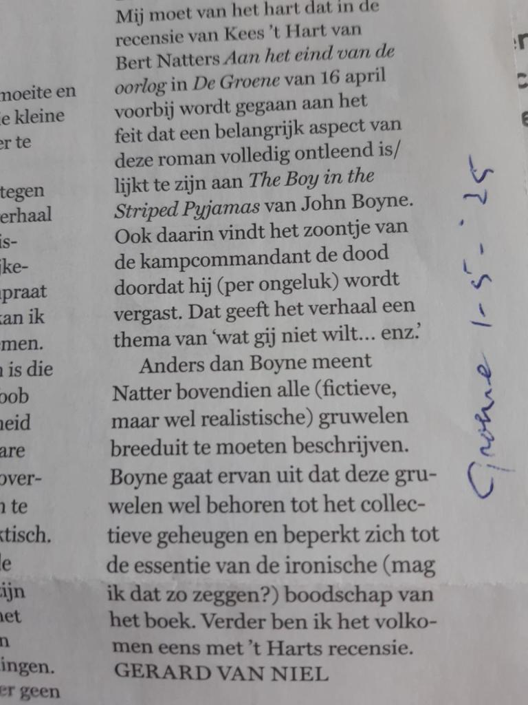 Over de kwestie van de al dan niet gestolen plot schreef ik een tijdje geleden dit stuk en later nog dit naschrift. Ik wil nog vermelden, als reactie op de laatste alinea van de ingezonden brief, dat Boyne juist kritiek op zijn boek kreeg, omdat hij wegkijkt van de gruwelen, zoals hier in The New York Times: