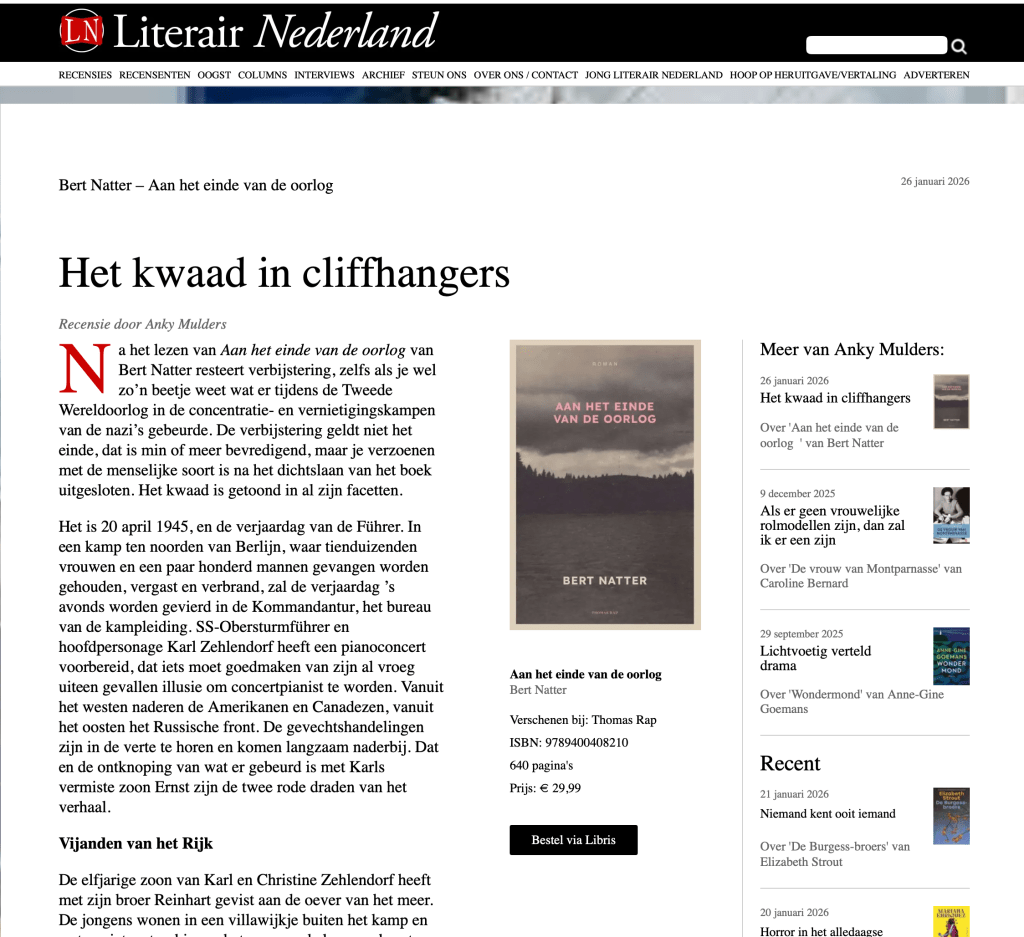 Een mooie bespreking van Aan het einde van de oorlog op Literair Nederland: ‘Het kwaad in cliffhangers‘. Anky Mulders schrijft onder meer: