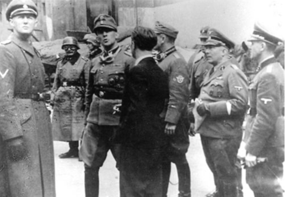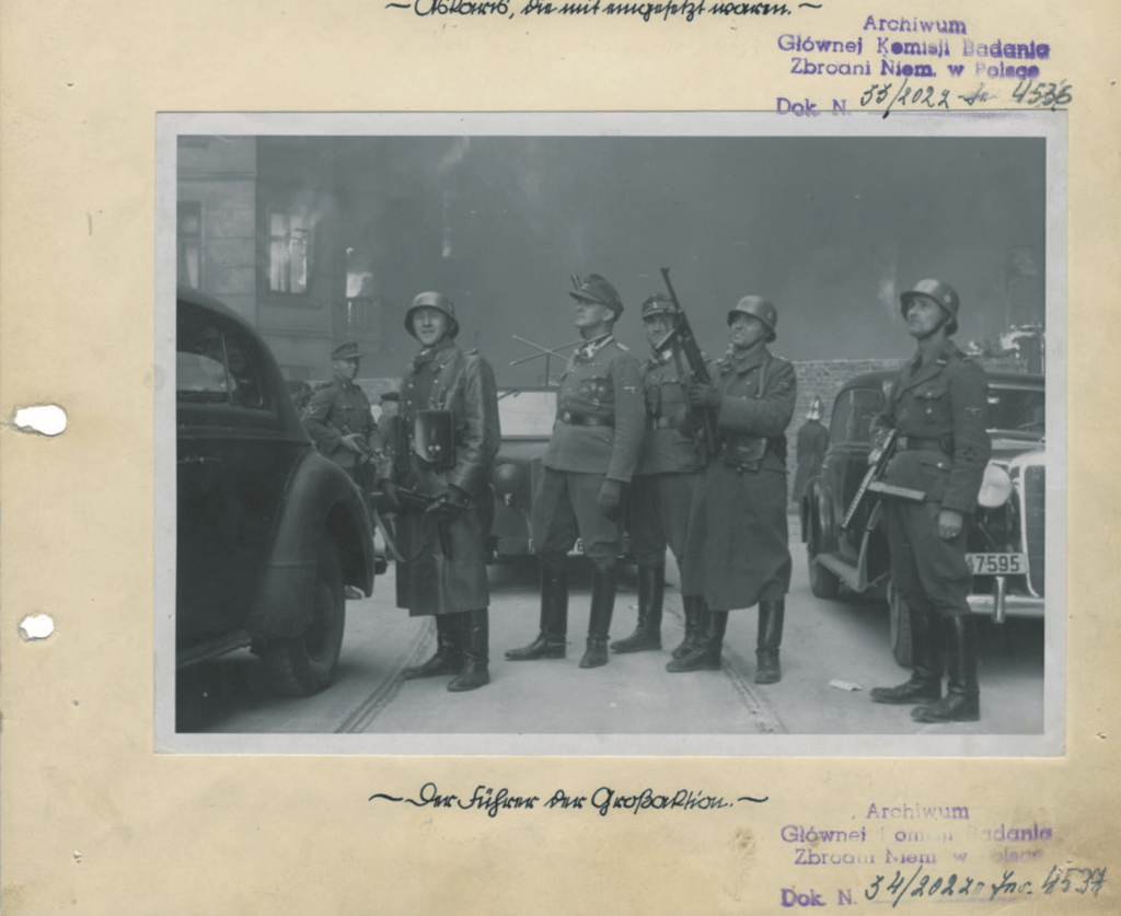 De foto is afkomstig uit het zogenaamde Stroop-Bericht, een rapport dat door Höheren SS- und Polizeiführer Jürgen Stroop (op de foto hierboven is Stroop de derde van links) (Blösche, over wie ik het verderop nog zal hebben, staat rechts) voor Reichsführer SS Heinrich Himmler werd gemaakt over de ontruiming van het ghetto van Warschau, op zwaar en sjiek papier, ingebonden in echt leder, dat hij kreeg aangeboden onder de triomfantelijke titel Es gibt keinen jüdischen Wohnbezirk — in Warschau mehr! Uitroepteken!