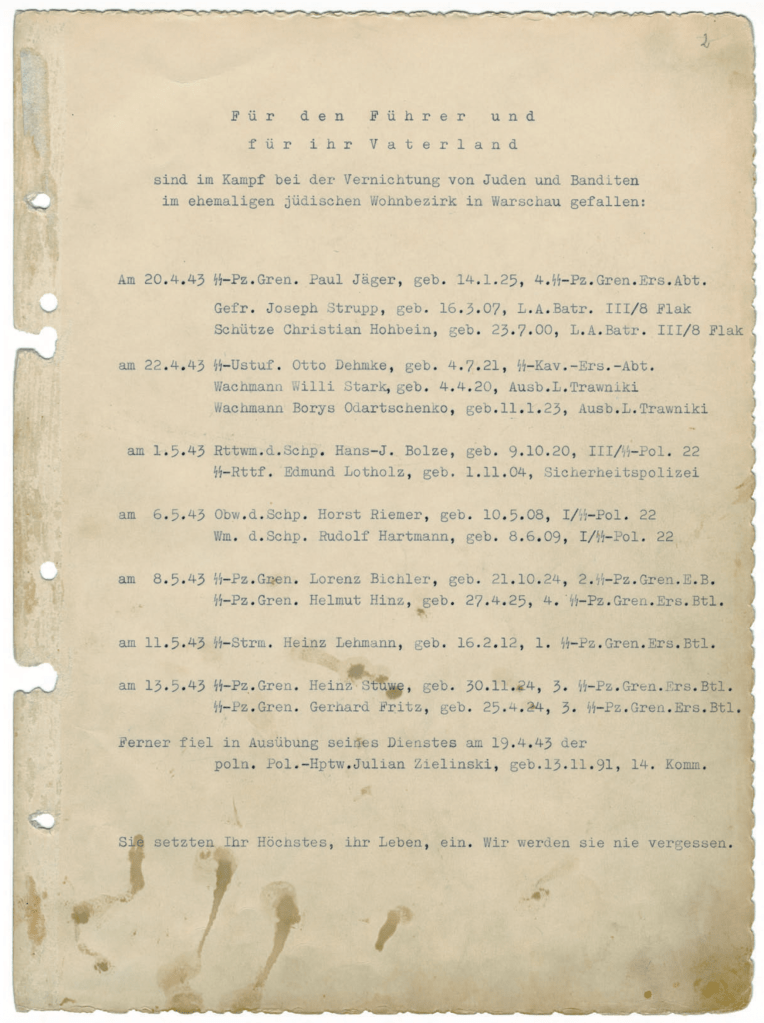 Het boekwerk begint met een getypte lijst namen van tussen 22 april 1943 en 13 mei 1943 ‘in de strijd bij de vernietiging van Joden en Bandieten gevallen’ SS-ers: vijftien man in totaal en als je de Poolse politieman die blijkbaar ook het loodje legde erbij optelt zestien — de vergelijking met Mein Kampf dringt zich op, dat boek is immers opgedragen aan de nagedachtenis van zestien ‘Blutzeugen’ die voor de nationaal-socialistische zaak zijn gevallen bij Hitlers mislukte putsch op 9 november 1923, om 12:30 in de middag.