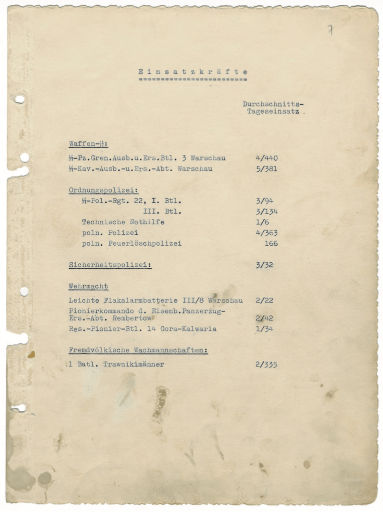 [Toch ook interessant, deze lijst met ingezette manschappen tijdens de ‘actie’, want in Duitsland geloven nog steeds veel mensen dat de SS wel betrokken was bij oorlogsmisdaden en de Wehrmacht niet. Dus wel, ze hielpen bij de moordpartij in het ghetto van Warschau.]