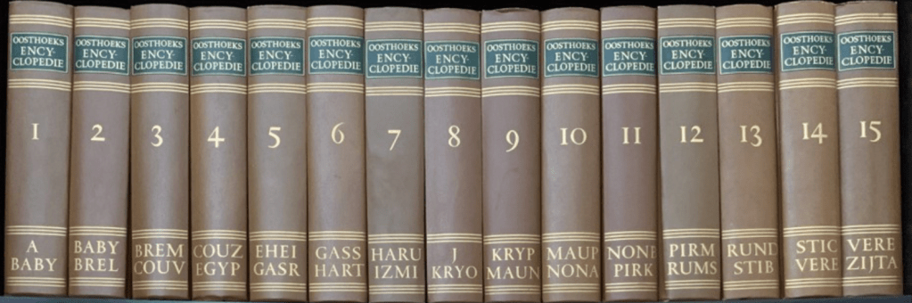 In de boekenkast in mijn ouderlijk huis stond ooit de complete Oosthoeks Encyclopedie in bruine leren banden. Mijn ouders hadden een abonnement op dat ding. Ze begonnen ergens eind jaren zestig samen met A—BABY en eindigden in de jaren zeventig met VERT—ZIJTA. Dat laatste deel was mijn favoriet toen ik op de lagere school zat, want in dat deel zaten pagina’s met kleurenafbeeldingen van ‘vlaggen’ en ‘wapens’ van provincies en steden die ik heel mooi vond. Daar las ik ook over de ‘wereldoorlog’, nog voor ik er van mijn ouders of de meester over hoorde. Er was één illustratie bij het uitgebreide lemma over de Tweede Wereldoorlog die me eindeloos fascineerde.