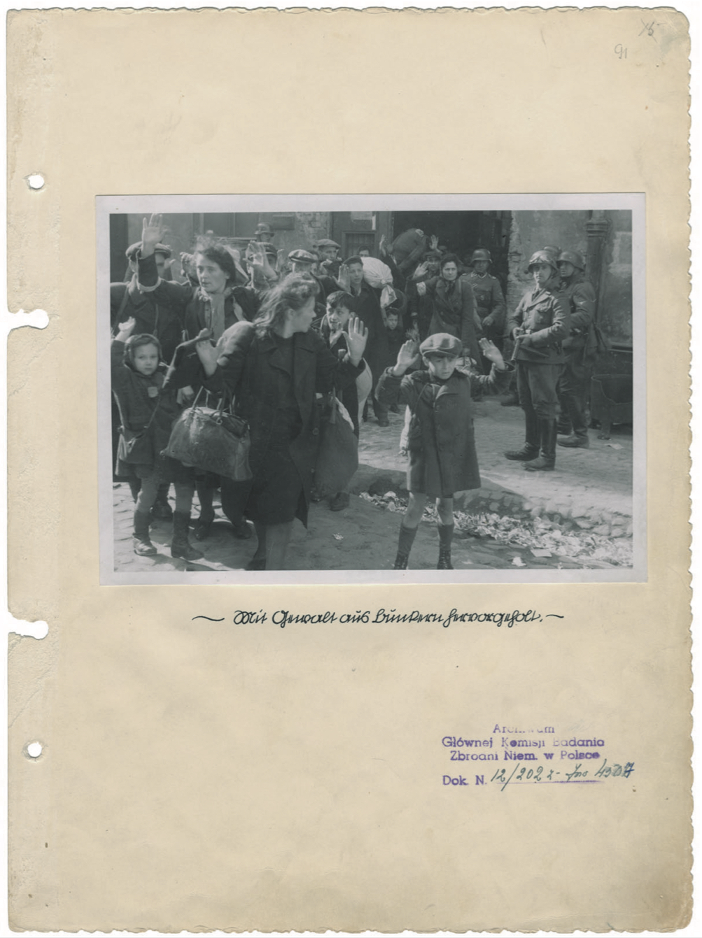 Het onderschrift van de beroemde foto van het jongetje luidt: Mit Gewalt aus Bunkern hervorgeholt. Deze onschuldige burgers, vrouwen en kinderen, zouden ‘met geweld’ uit ‘de bunkers gehaald’ zijn. Zo zien ze er niet uit, bepakt en bezakt als ze zijn. Eerder lijken ze uit hun huizen gejaagd, waar ze al maanden in angstige afwachting zaten.