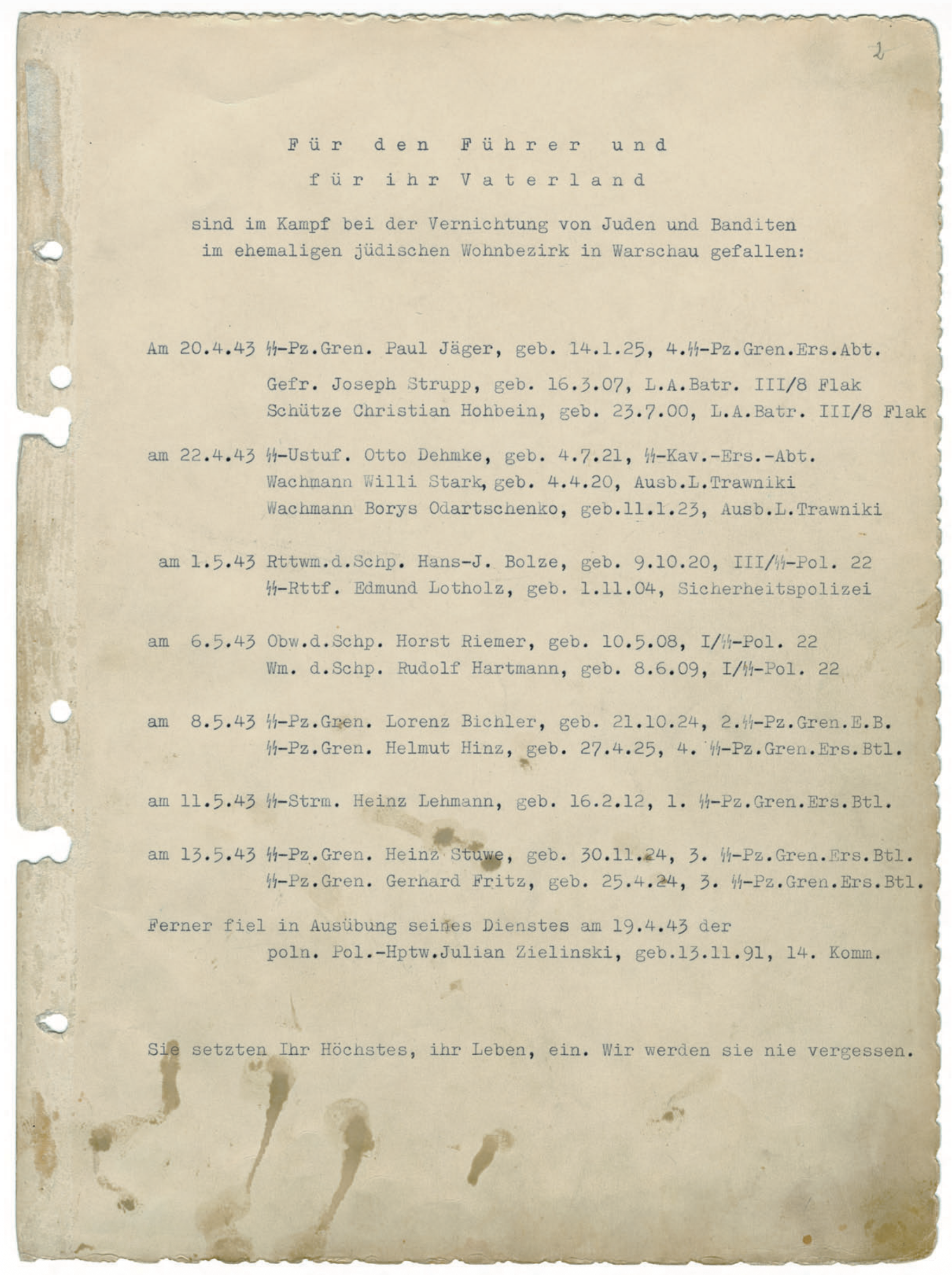 Het boekwerk begint met een getypte lijst namen van tussen 22 april 1943 en 13 mei 1943 ‘in de strijd bij de vernietiging van Joden en Bandieten gevallen’ SS-ers: vijftien man in totaal en als je de Poolse politieman die blijkbaar ook het loodje legde erbij optelt zestien — de vergelijking met Mein Kampf dringt zich op, dat boek is immers opgedragen aan de nagedachtenis van zestien ‘Blutzeugen’ die voor de nationaal-socialistische zaak zijn gevallen bij Hitlers mislukte putsch op 9 november 1923, om 12:30 in de middag.
