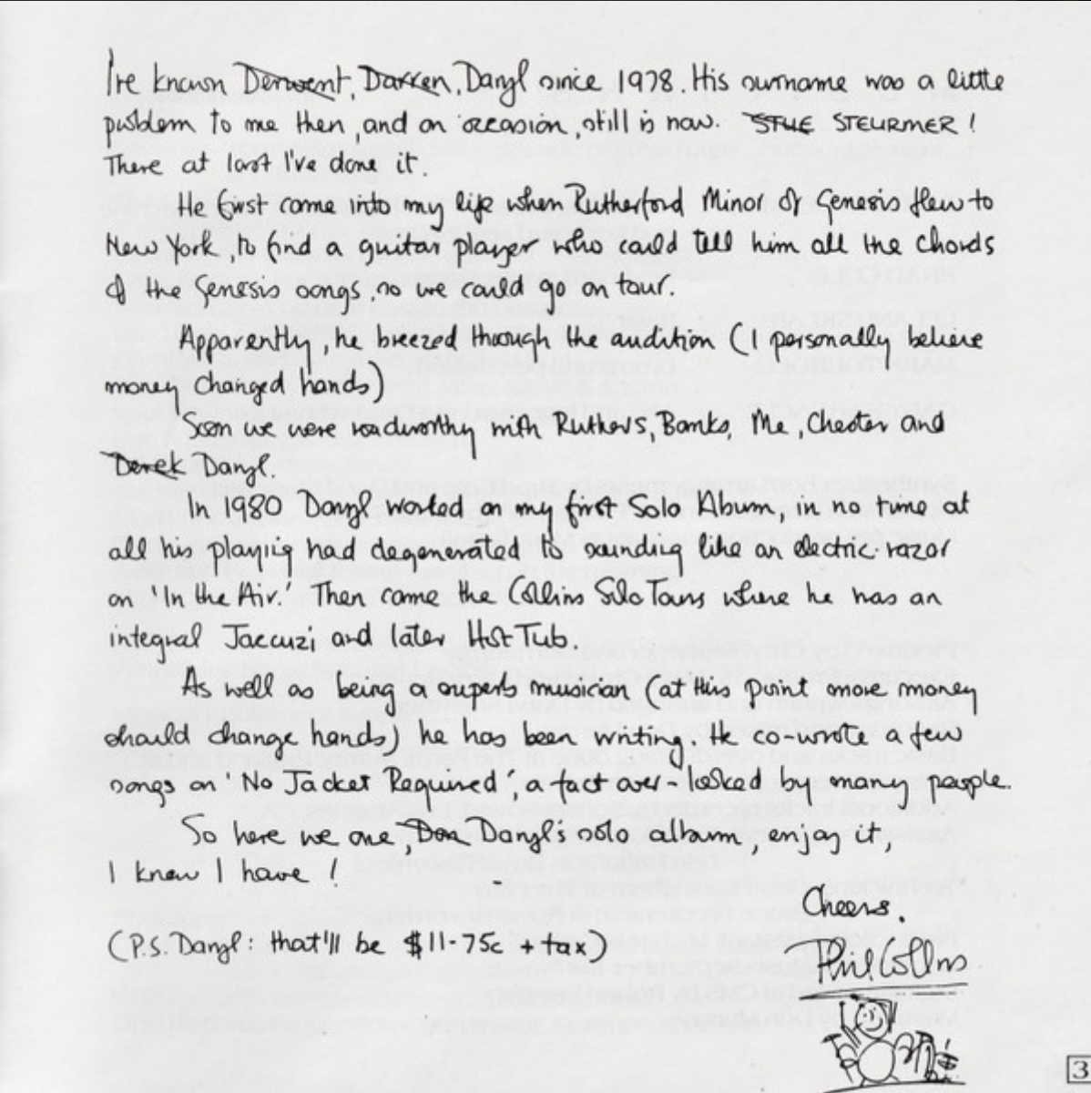 Ik erger me daar natuurlijk aan, maar ik moet ook altijd denken aan de komische aanbeveling die Phil Collins schreef voor het soloalbum Steppin Out (1988) van de gitarist die Genesis live versterkte en die onder andere gitaar speelt op ‘In the Air Tonight’: Daryl Stuermer.