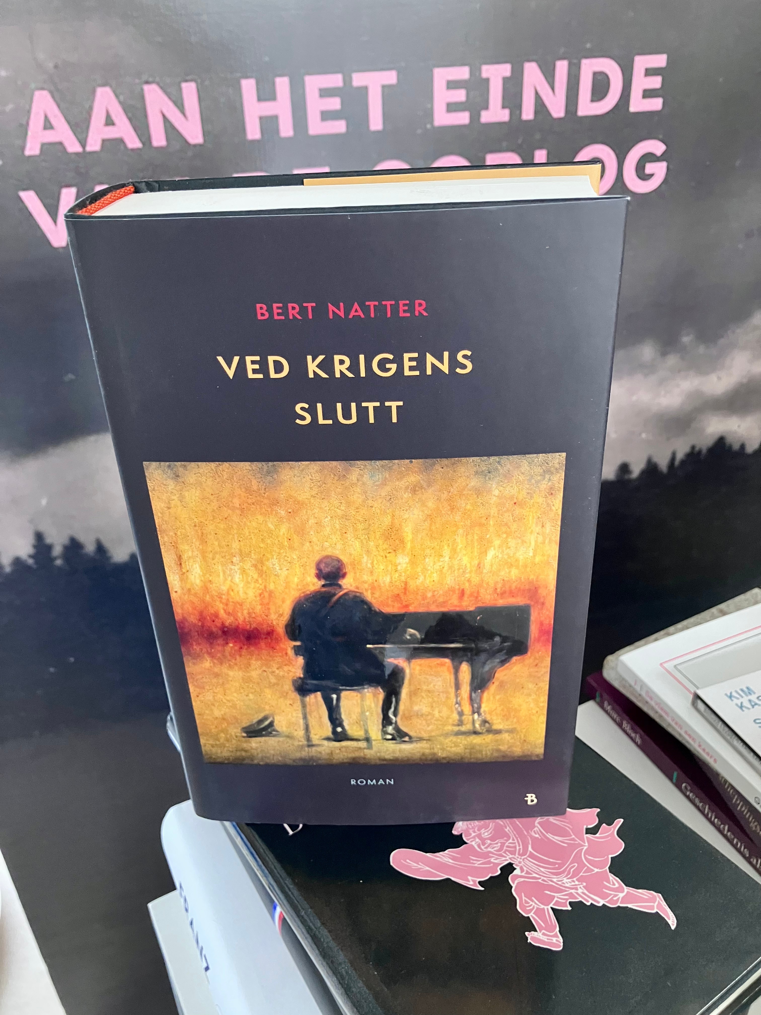 De Noorse editie van Aan het einde van de oorlog, vertaald door Hedda Vormeland en uitgegeven door Bonnier Norsk Vorlag, ziet er prachtig uit. Een dik gebonden boek van bijna 670 bladzijden met een huiveringwekkend schilderij van Vebjørn Sand op het voorplat, dat voorzien is van spotvernis. Het is voor mij heel bijzonder dit boek in handen te hebben.
