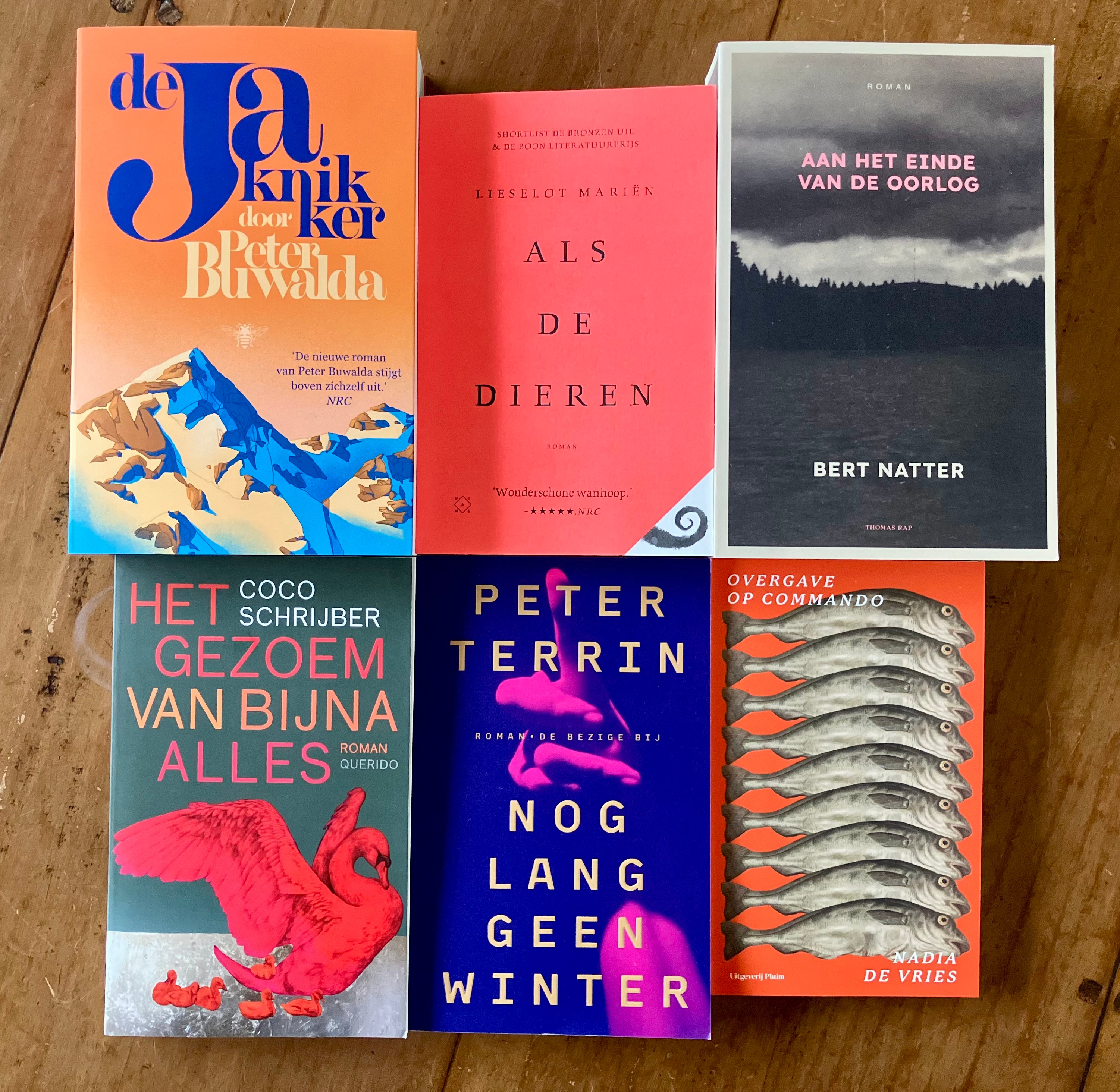 Het tweetal bracht prachtig nieuws: Aan het einde van de oorlog staat op de shortlist van de Libris Literatuurprijs 2026, samen met deze vijf andere boeken, die ik inmiddels allemaal gelezen heb, dus ik weet hoe divers het lijstje is en hoe hevig de concurrentie: De jaknikker van Peter Buwalda, Als de dieren van Lieselot Mariën, Het gezoem van bijna alles van Coco Schrijber, Nog lang geen winter van Peter Terrin en Overgave op commando van Nadia de Vries. Ik vind het een mooie keuze die laat zien dat roze, rood en oranje goede kleuren voor een omslag zijn, maar vooral wat de Nederlandse literatuur heden ten dage vermag.