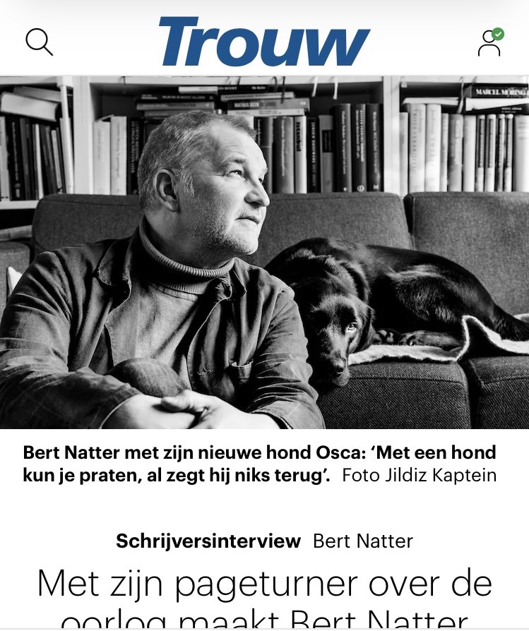 In Trouw (nu al online, zaterdag op papier) een mooi interview dat Janita Monna met mij had over Aan het einde van de oorlog en Zonderhond. Dit gebeurde onder het wakend oog van Osca, onze nieuwe hond, die ook figureert op de fraaie foto’s van Jildiz Kaptein.