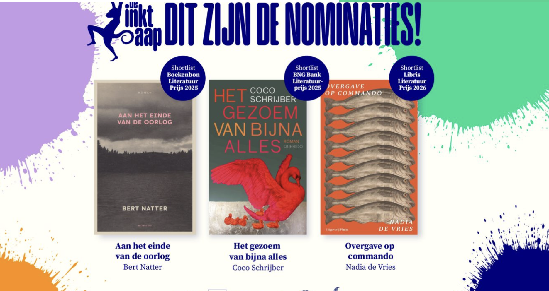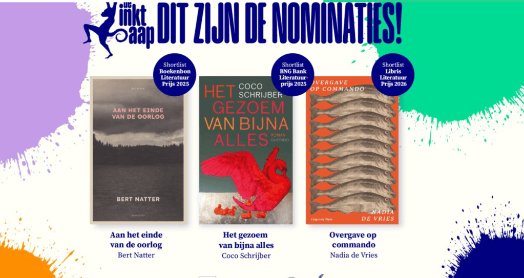 Prachtig nieuws: samen met Het gezoem van bijna alles van Coco Schrijber en Overgave op commando van Nadia de Vries is mijn roman Aan het einde van de oorlog genomineerd voor de literaire jongerenprijs Inktaap 2027!
