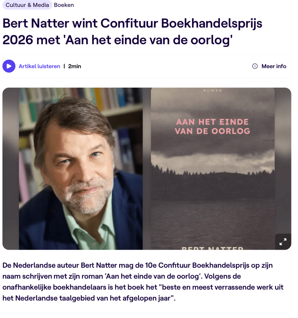 De VRT brengt vanmorgen mooi nieuws: mijn roman Aan het einde van de oorlog is bekroond met de 10de Confituur Boekhandelsprijs: het ‘beste en meest verrassende werk uit het Nederlandse taalgebied van het afgelopen jaar’. De prijs wordt toegekend door 22 onafhankelijke Vlaamse boekwinkels die verenigd zijn in het Confituur-netwerk.